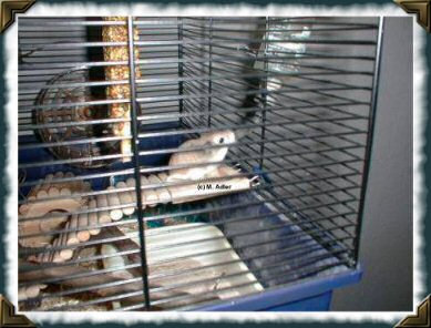 Ebenso kann man eine sog. Knabberstange in den Käfig hängen, die auch eifrig zum Klettern und Fressen benutzt wird.