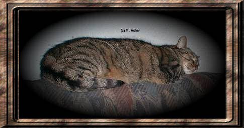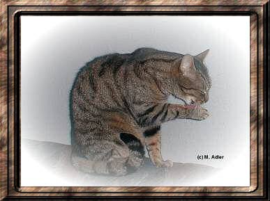 Ich heiße Mirschko und bin eine Englisch Kurzhaar-Katze getigert und wurde am 10.04.1993 geboren Ich mag es nicht, wenn ich gestört werde Wer schön sein will, muß sich putzen oder genug schlafen (c) Manuela Adler Bild : mein Kater Mirschko