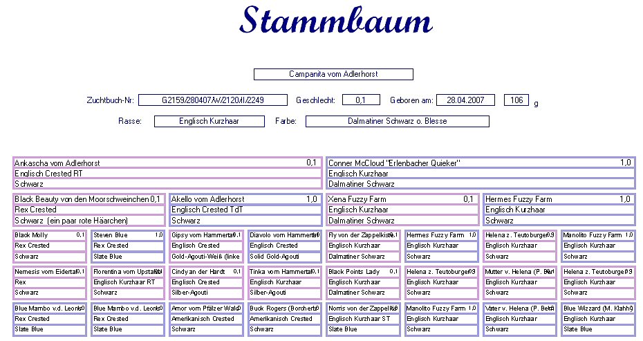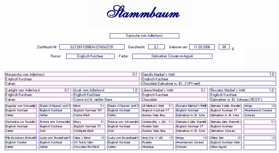 Campanita vom Adlerhorst Engl. Kurzhaar (RT) Dalmatiner Schwarz Geb. : 28.04.2007 Mutter : Ankascha vom Adlerhorst, Englisch Crested RT, Schwarz Vater : Connor McCloud "Erlenbacher Quieker", E. Kurzhaar, Dalmatiner Schwarz |