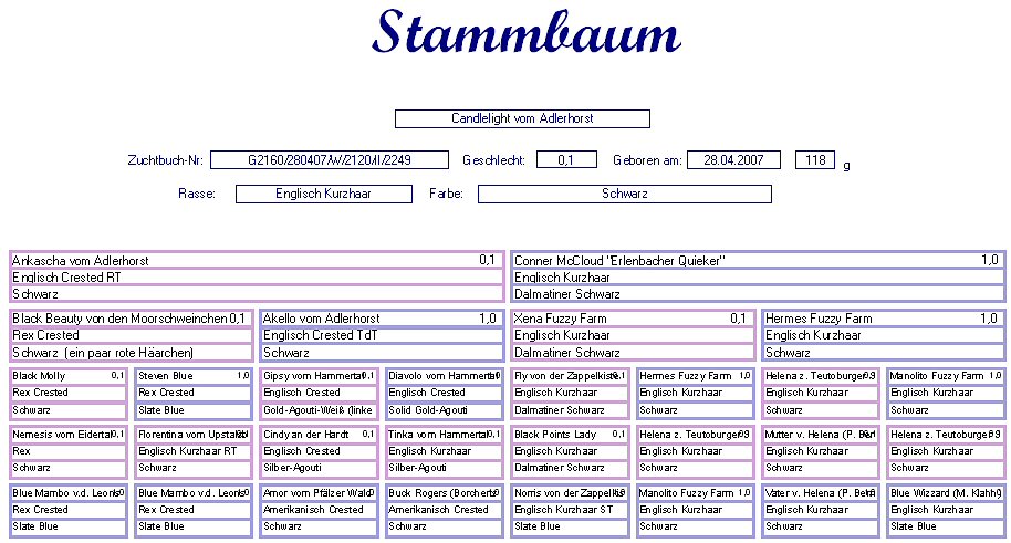 Candlelight vom Adlerhorst Engl. Kurzhaar (RT) Schwarz Geb. : 28.04.2007 Mutter : Ankascha vom Adlerhorst, Englisch Crested RT, Schwarz Vater : Connor McCloud "Erlenbacher Quieker", E. Kurzhaar, Dalmatiner Schwarz |