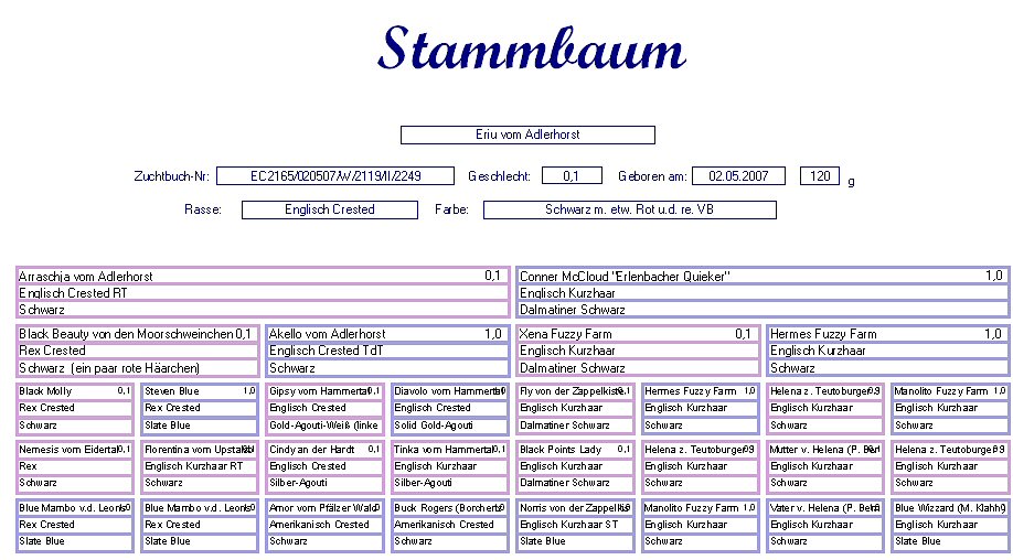 Akello vom Adlerhorst Englisch Crested Schwarz Geb. : 10.10.2004 Mutter : Gipsy vom Hammertal, Engl. Crested, Gold-Agouti-Weiß Vater : Diavolo vom Hammertal, Engl. Crested, Solid Gold-Agouti |