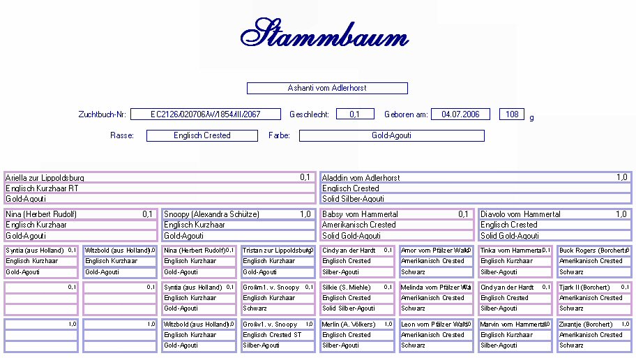 Englisch Crested Gold-Agouti spalt in Solid Silber-Agouti Geb. : 04.07.2006 Mutter : Ariella z. Lippoldsburg, Engl. Kurzhaar RT, Gold-Agouti Vater : Aladdin v. Adh., Engl. Crested, Solid Silber-Agouti |