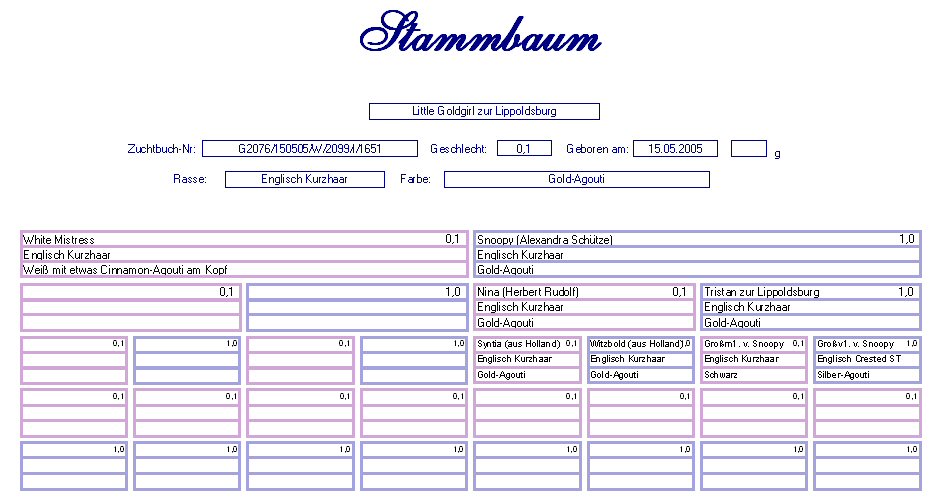 Little Goldgirl zur Lippoldsburg Englisch Kurzhaar Gold-Agouti spalt in Cinnamon-Agouti Geb. : 15.05.2005 Mutter : White Mistress, E. Kurzhaar, Cinnamon-Agouti Vater : Snoopy, E. Kurzhaar, Gold-Agouti |