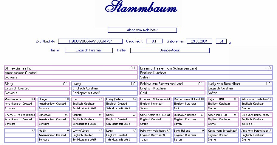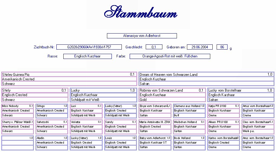 Englisch Kurzhaar Gold-Agouti-Rot-Weiß spalt in Safran Geb. : 29.06.2004 Mutter : Shirley Guinea Pig, Amerik. Crested, Schwarz Vater : Dream of Heaven v. Schw. Land, Engl. Kurzhaar, Safran |