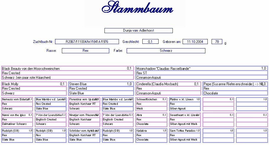 Rex Schwarz spalt in Silber-Agouti Geb. : 11.10.2004 Mutter : Black Beauty v. d. Moorschw., Rex Crested, Schwarz Vater : Moonshadow Claudia´s Rasselbande, Rex ST, Cinnamon-Agouti |