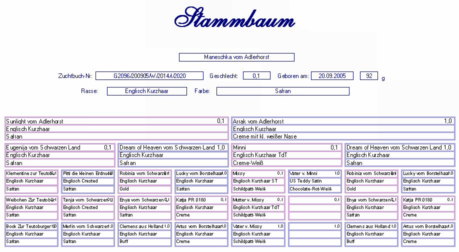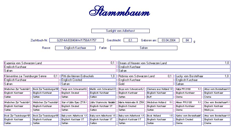 Englisch Kurzhaar Beige-Safran-Argente Geb. : 16.08.2004 Mutter : Tasha v. Adlerhorst, E. Kurzhaar, Schwarz Vater : Dream of Heaven v. Schw. Land, E. Kurzhaar, Safran |