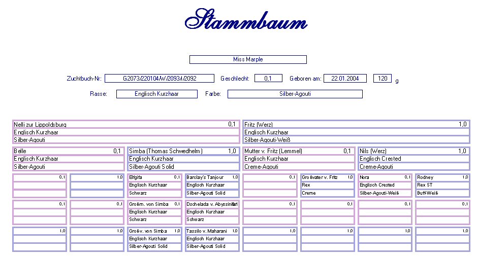 Miss Marple Rentnerin Englisch Kurzhaar Silber-Agouti Geb. : 22.01.2004 Mutter : Nelli z. Lippoldsburg, E. Kurzhaar, Silber-Agouti Vater : Fritz, E. Kurzhaar, Silber-Agouti-Weiß |