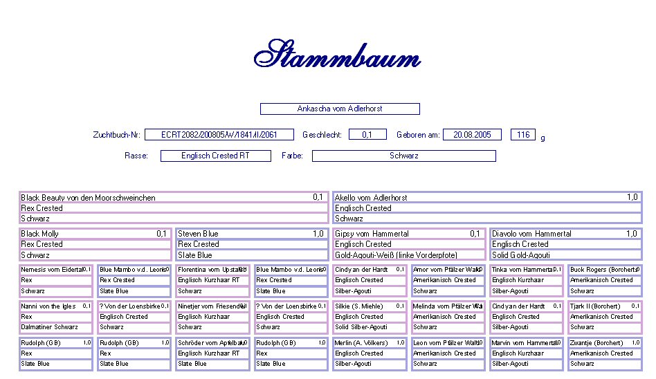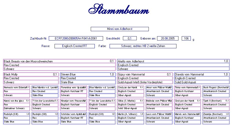 Ankascha vom Adlerhorst Englisch Crested RT Schwarz Geb. : 20.08.2005 Mutter : Black Beauty v.d.Moorschw., Rex Crested, Schwarz Vater : Akello v.Adh., E. Crested, Schwarz |