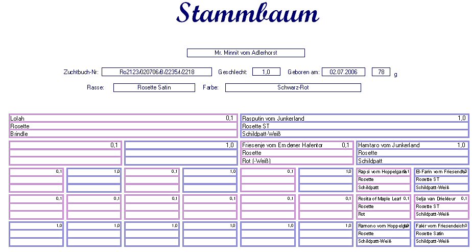 Mr. Minnit vom Adlerhorst Rosette Satin Schldpatt spalt in Schildpatt-Weiß Geb. : 02.07.2006 Mutter : Lolah, Rosette ST, Brindle Vater : Rasputin v. Junkerland, Rosette ST, Schildpatt-Weiß |