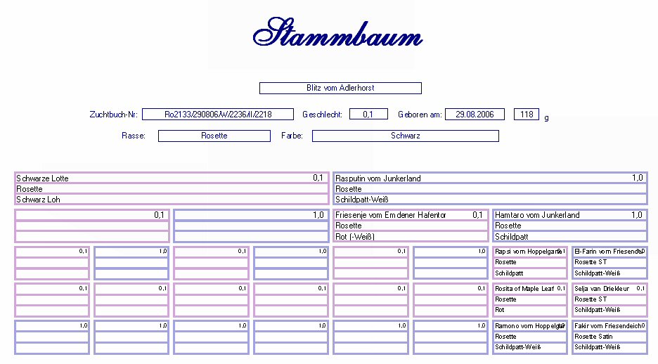 Blitz vom Adlerhorst Rosette Schwarz spalt in Schildpatt-Weiß Geb. : 29.08.2006 Mutter : Schwarze Lotte, Rosette, Schwarz-Loh Vater : Rasputin v. Junkerland, Rosette ST, Schildpatt-Weiß |