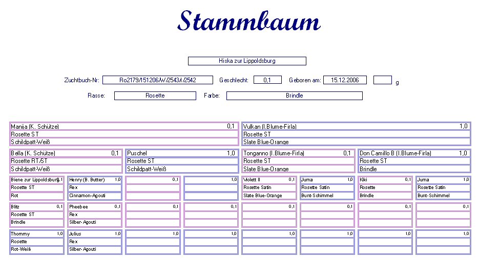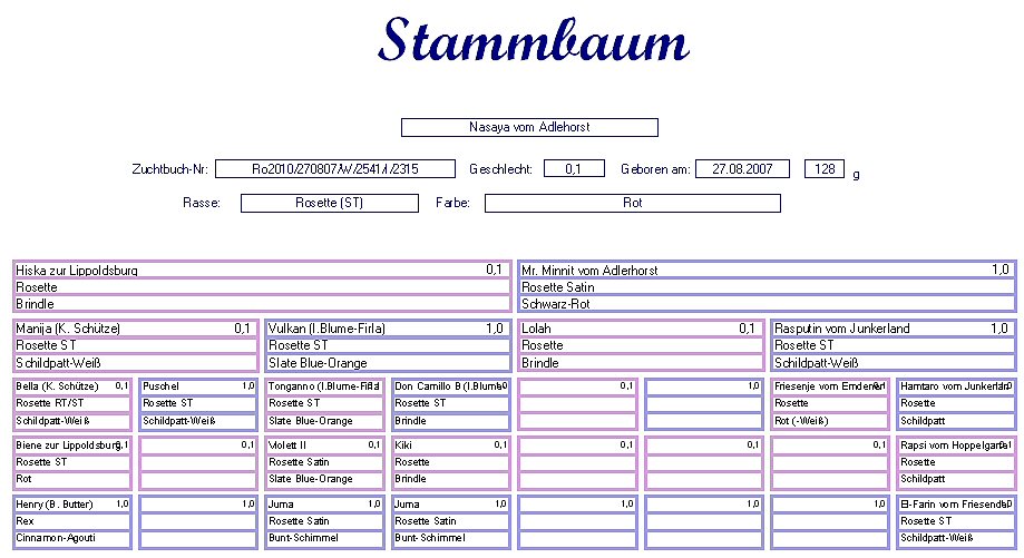 Nasaya vom Adlerhorst --> in Aufzucht Rosette ST Rot mit weißen Zehen am li. VB Geb. : 27.08.2007 Mutter : Hiska z. Lippoldsburg, Rosette, Schildpatt Vater : Mr. Minnit v. Adh., Satin Rosette, Schildpatt |
