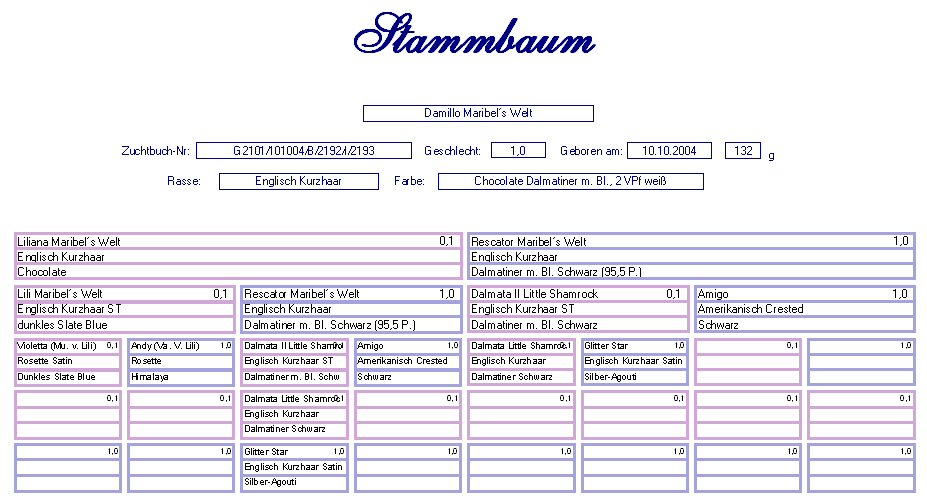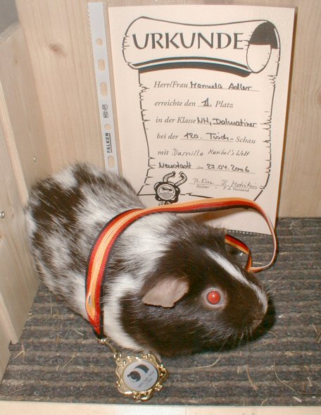 Englisch Kurzhaar Dalmatiner Chocolate Geb. : 10.10.2004 Mutter : Liliana Maribel´s Welt, Engl. Kurzhaar, Chocolate Vater : Rescator Maribel´s Welt, Engl. Kurzhaar, Dalmatiner Schwarz TS am 23.04.2006 : SG mit 93,5 Punkten --> 1. Platz in der Klasse "Normalhaar Dalmatiner" |