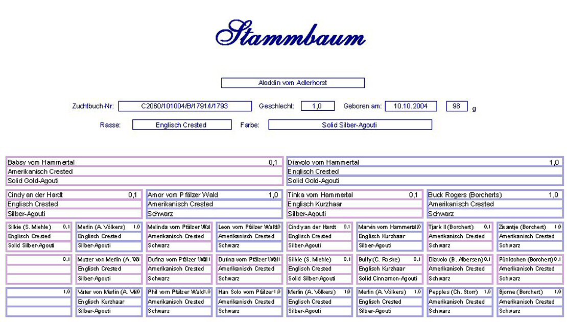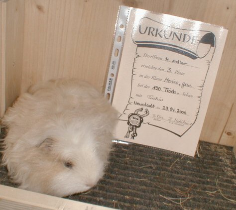Englisch Crested Solid Silber-Agouti Geb. : 10.10.2004 Mutter : Babsy v. Hammertal, Amerik. Crested, Solid Gold-Agouti Vater : Diavolo v. Hammertal, Engl. Crested, Solid Silber-Agouti Stammbaum (132 kb) TS am 23.04.2006 : SG mit 92,5 Punkten |