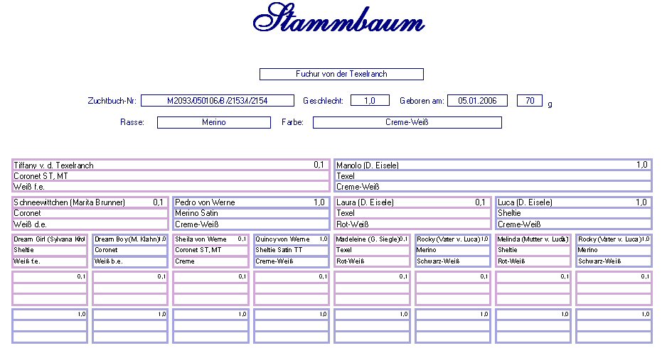 Merino Creme-Weiß Geb. : 05.01.2006 in Aufzucht Mutter : Tiffany von der Texelranch,, Coronet ST, MT, Weiß f.e. Vater : Manolo (D. Eisele), Texel, Creme-Weiß TS am 23.04.2006 : SG mit 93 Punkten --> 3. Platz in der Klasse "Merino gemischt" |