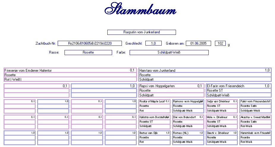 Rosette Schildpatt-Weiß Geb. : 01.06.2005 Mutter : Friesenje vom Emdener Hafentor, Rosette, Rot(-Weiß) Vater : Hamtaro vom Junkerland, Rosette, Schwarz-Rot TS am 23.04.2006 : SG mit 94 Punkten |